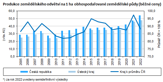 Celková zemědělská i rostlinná produkce na 1 ha obhospodařované zemědělské půdy v průběhu let 2005–2022 v kraji převážně rostla, u živočišné produkce se situace v jednotlivých letech vyvíjela různě s tendencí k poklesu. V porovnání s rokem 2005 byla živočišná produkce v kraji v roce 2022 nižší o 6,3 %, zatímco v celé ČR se zvýšila o více jak 40 %. V průběhu sledovaného období nedosahovala živočišná produkce na 1 ha obhospodařované půdy úrovně ČR a postupně se snižovala – zatímco v roce 2005 dosahovala 62,1 % průměru ČR, v roce 2022 to bylo podle semidefinitivních výsledků pouze 41,4 %, což bylo nejméně od roku 2005. Rostlinná produkce na 1 ha obhospodařované půdy naproti tomu byla po celé období vyšší, než činil průměr ČR a pohybovala se v intervalu mezi 105,2 až 122,5 % průměru ČR.