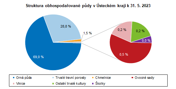 K 31. 5. 2023 bylo v Ústeckém kraji 220 135 ha obhospodařované půdy, což bylo 6,2 % veškeré obhospodařované půdy v ČR. Největší podíl obhospodařované půdy v kraji dlouhodobě připadá na ornou půdu a pohybuje se okolo 70 %. Co do rozlohy jsou druhou nejvýznamnější obhospodařovanou kulturou v kraji trvalé travní porosty. Ústecký kraj je jedním ze čtyř krajů, ve kterých se pěstuje chmel. Výměra obhospodařovaných chmelnic je v Ústeckém kraji nejvyšší mezi kraji, v roce 2023 se zde nacházelo 57,3 % (3 195 ha) všech obhospodařovaných chmelnic v ČR.
