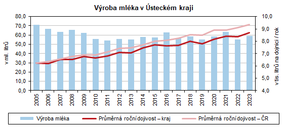 Objem vyrobeného mléka v kraji v období 2005–2011 meziročně převážně klesal. Zatímco v roce 2005 bylo v kraji vyrobeno 71 072 tis. litrů mléka, v roce 2011 to bylo jen 54 090 tis. litrů mléka. V období 2012–2023 měla výroba mléka v kraji stoupající trend. Na celkové výrobě mléka v ČR se kraj ve sledovaném období podílel jen málo a jeho význam v produkci mléka klesal. Zatímco se v roce 2005 vyrobilo v kraji 2,6 % veškerého mléka v ČR, v letech 2022 a 2023 to bylo shodně jen 1,7 %.