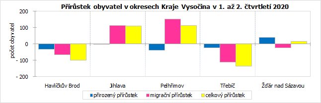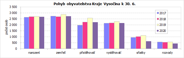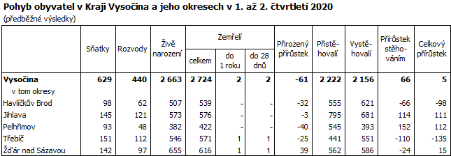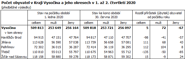 Ke konci června 2020 žilo v Kraji Vysočina 509 818 obyvatel, což bylo oproti stavu na začátku roku o 5 osob více (v mezikrajském srovnání šestý nejvyšší přírůstek). Počet mužů se v kraji zvýšil o 72, žen ubylo 67. Za celkovým nepatrným přírůstkem obyvatel stojí výhradně kladné migrační saldo, přirozenou měnou se počet osob na Vysočině snížil o 61. Do kraje se přistěhovalo 2 222 osob, vystěhovalých bylo 2 156. Živě se v kraji v prvních šesti měsících roku 2020 narodilo 2 663 dětí, z toho 45,0 % mimo manželství (v meziročním srovnání o 1,3 procentního bodu méně). Ve stejném období zemřelo 2 724 osob, přirozenou měnou tak ubylo 61 obyvatel.