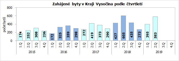 V 1. až 2. čtvrtletí 2019 byla v Kraji Vysočina zahájena výstavba 978 bytů, což bylo o 54 bytů méně než v prvních šesti měsících roku 2018 (- 5,2 %, tj. druhý nejvyšší úbytek v rámci krajů). Počet nově zahájených bytů byl na Vysočině mezi kraji České republiky osmý nejvyšší, vyšší počet zahájených bytů byl zaznamenán ve Středočeském kraji, Praze, Jihomoravském, Moravskoslezském, Plzeňském, Olomouckém a Jihočeském kraji. Na celkovém počtu zahájených bytů v České republice se Vysočina podílela 5,1 %. Pokles počtu zahájených bytů byl ve srovnání se stejným obdobím roku 2017 zaznamenán ve čtyřech regionech, nejvýraznější ve Středočeském kraji (o 6,5 %). K nejvýraznějšímu nárůstu počtu zahájených bytů došlo v Libereckém kraji.