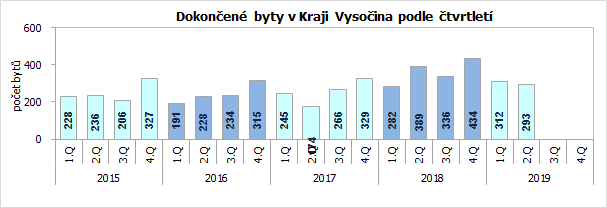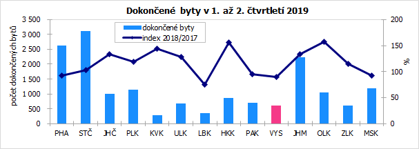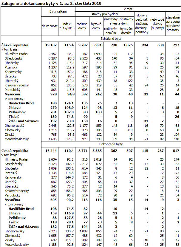 Počet dokončených bytů v Kraji Vysočina v lednu až červnu 2019 činil 605 a oproti stejnému období předchozího roku se snížil o 9,8 %. Vývoj v kraji tak výrazně lišil od celorepublikového trendu – v celé České republice se počet dokončených bytů zvýšil o 10,4 %. Zvýšení počtu dokončených bytů bylo zaznamenáno ve většině regionů České republiky s výjimkou hlavního města, nejvýraznější bylo v Olomouckém (o 57,7 %) a Královéhradeckém kraji (o 56,0 %). Vysočina se zařadila mezi pět krajů, v nichž došlo k poklesu počtu dokončených bytů. Nejvyšší byl v Libereckém kraji (o 24,8 %), Vysočina se zařadila hned za něj.