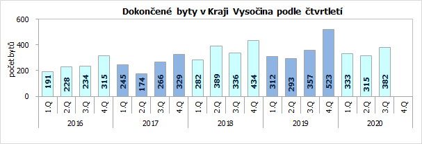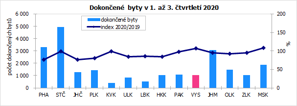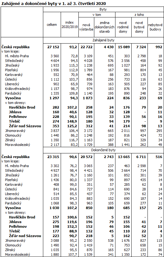 Počet dokončených bytů v Kraji Vysočina v lednu až září 2020 činil 1 030 a oproti stejnému období předchozího roku se zvýšil o 7,2 %. Vývoj v kraji se tak výrazně lišil od celorepublikového trendu – v celé České republice se počet dokončených bytů snížil o 9,4 %. Zvýšení počtu dokončených bytů bylo kromě Vysočiny zaznamenáno pouze v jediném regionu České republiky - v Moravskoslezském kraji (o 7,7 %). K nejhlubšímu meziročnímu propadu počtu dokončených bytů došlo v Praze (o 23,8 %) a Jihočeském kraji (o 23,3 %).