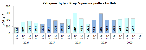 V 1. až 3. čtvrtletí 2020 byla v Kraji Vysočina zahájena výstavba 1 297 bytů, což bylo o 79 bytů méně než v prvních devíti měsících roku 2019 (- 5,7 %, tj. šestý nejvyšší úbytek v rámci krajů). Počet nově zahájených bytů byl na Vysočině mezi kraji České republiky pátý nejnižší, menší počet zahájených bytů byl zaznamenán v Královéhradeckém, Ústeckém, Libereckém a Karlovarském kraji. Na celkovém počtu zahájených bytů v České republice se Vysočina podílela 4,8 %.