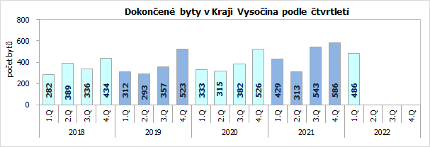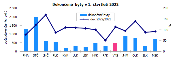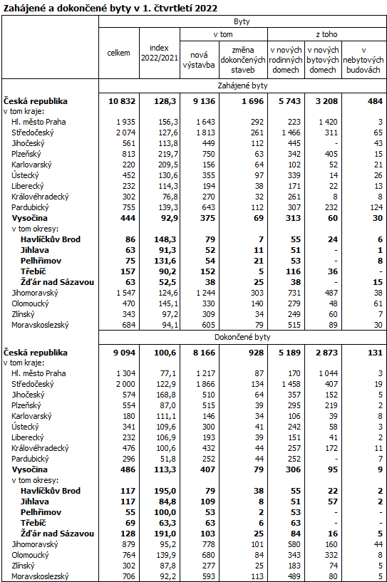 Počet dokončených bytů v Kraji Vysočina v lednu až březnu 2022 činil 486 a oproti prvním třem měsícům předchozího roku se zvýšil o 13,3 %. Vývoj v kraji tak výrazně předstihl celorepublikový trend – v celé České republice se počet dokončených bytů zvýšil pouze o 0,6 %. Vysočina se tak zařadila na čtvrté místo mezi osmi regiony České republiky, ve kterých bylo zaznamenáno meziroční zvýšení počtu dokončených bytů. Počet dokončených bytů poklesl meziročně v šesti krajích, nejvíce v Pardubickém (-48,2 %).