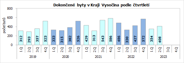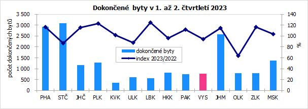 Počet dokončených bytů v Kraji Vysočina v lednu až červnu 2023 činil 762 a oproti prvním šesti měsícům předchozího roku se snížil o 5,5 %. Vývoj v kraji se tím lišil od celorepublikového trendu – v celé České republice se počet dokončených bytů zvýšil o 2,7 %. Meziroční snížení počtu dokončených bytů bylo zaznamenáno v pěti krajích. Počet dokončených bytů vzrostl meziročně v devíti regionech, nejvíce v Libereckém kraji (+24,6 %).