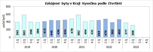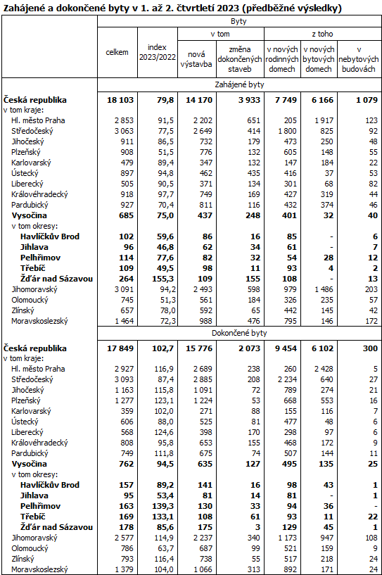 V 1. až 2. čtvrtletí 2023 byla na Vysočině podle předběžných výsledků zahájena výstavba 685 bytů, což bylo o 238 bytů méně než v prvních šesti měsících roku 2022 (-25,0 %), v mezikrajském srovnání šlo o pátý nejhlubší pokles. Počet nově zahájených bytů byl na Vysočině mezi kraji České republiky čtvrtý nejnižší, nižší počet zahájených bytů byl zaznamenán v Karlovarském, Libereckém a Zlínském kraji. Na celkovém počtu zahájených bytů v České republice se Vysočina podílela 3,8 %.