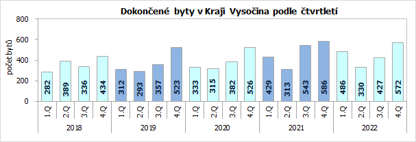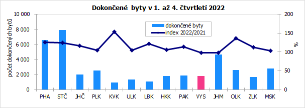 Počet dokončených bytů v Kraji Vysočina v lednu až prosinci 2022 činil 1 815 a oproti dvanácti měsícům předchozího roku se snížil o 2,8 %. Vývoj v kraji se tím lišil od celorepublikového trendu – v celé České republice se počet dokončených bytů zvýšil o 14,1 %. Vedle Vysočiny bylo meziroční snížení počtu dokončených bytů zaznamenáno už jen v Jihomoravském kraji. Počet dokončených bytů vzrostl meziročně v dvanácti regionech, nejvíce v Karlovarském kraji (+53,1 %).