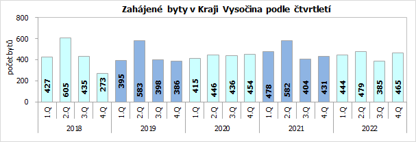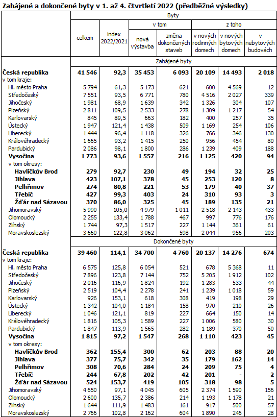 V 1. až 4. čtvrtletí 2022 byla na Vysočině podle předběžných výsledků zahájena výstavba 1 773 bytů, což bylo o 122 bytů méně než ve dvanácti měsících roku 2021 (-6,4 %), v mezikrajském srovnání šlo o šestý nejhlubší pokles. Počet nově zahájených bytů byl na Vysočině mezi kraji České republiky pátý nejnižší, nižší počet zahájených bytů byl zaznamenán v Karlovarském, Libereckém, Královéhradeckém a Zlínském kraji. Na celkovém počtu zahájených bytů v České republice se Vysočina podílela 4,3 %.