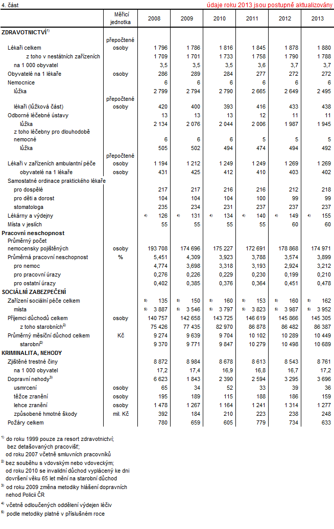 Časové řady kraj - 4. část - Zdravotnictví, pracovní neschopnost, sociální zabezpečení, kriminalita, dopravní nehody, požáry