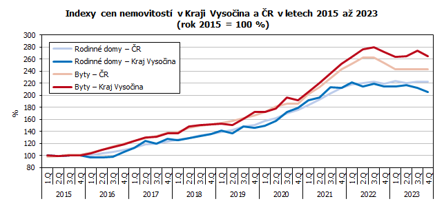 Informaci o vývoji cen nemovitostí v Kraji Vysočina a v České republice poskytuje časová řada cenových indexů v jednotlivých čtvrtletích s bazickým rokem 2015. Celostátně zaznamenáváme plynulý nárůst u cen rodinných domů i bytů s kulminací a následným poklesem v závěru roku 2022 a stagnací v roce 2023. Ve sledovaném období ceny bytů v ČR rostly strměji než ceny rodinných domů a pokles na konci roku 2022 byl u bytů výraznější než u rodinných domů. Krajské hodnoty cen nemovitostí většinou kopírovaly republikové trendy. Od roku 2020 sledujeme vyšší tempo růstu cen bytů na krajské úrovni než celostátní, ceny rodinných domů v kraji rostly od roku 2020 také rychleji než celostátní, ale od roku 2022 je to naopak.
