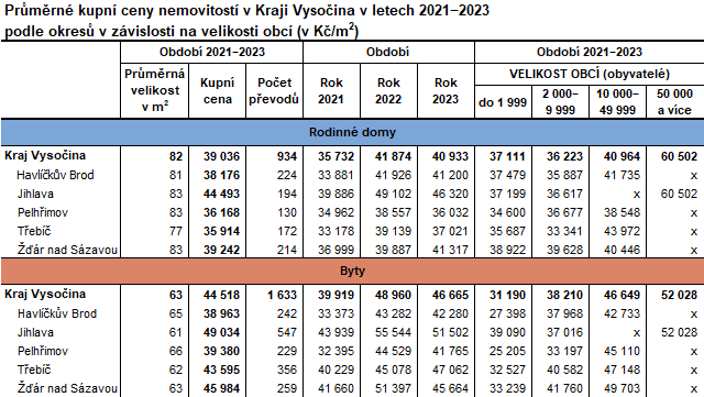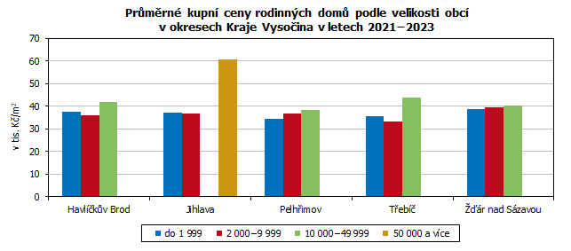 Obecně můžeme říci, že se průměrná kupní cena zvyšuje s rostoucí velikostí obce, v níž se rodinný dům nachází. Dle průměrných kupních cen rodinných domů za tříleté období 2021—2023 toto zcela platilo v okresech Pelhřimov a Žďár nad Sázavou. V okresech Havlíčkův Brod, Jihlava a Třebíč mírně převyšovala průměrná kupní cena rodinných domů stojících v obcích do 1 999 obyvatel průměrnou cenu rodinných domů v obcích od 2 000–9 999 obyvatel. Mezi obcemi velikosti od 10 000–49 999 obyvatel se rodinné domy za nejvyšší cenu prodávají v okrese Třebíč (43 972 Kč/m2). Tato cena převyšuje o více než 8 tis. Kč průměrnou cenu rodinných domů v okrese za stejné období bez zohlednění velikostí obcí. Nejvyšší průměrná cena rodinných domů vychází v Jihlavě (60 502 Kč/m2), jediné obci v největší velikostní skupině v našem kraji. Nejmenší rozdíly mezi cenami rodinných domů dle velikostních skupin obcí jsou v okrese Žďár nad Sázavou.