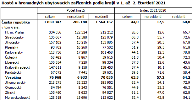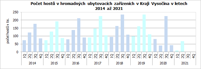 V průběhu 1. až 2. čtvrtletí roku 2021 uvítala hromadná ubytovací zařízení (hotely, penziony, chaty atd.) v České republice pouze asi 1,85 milionu hostů, což představovalo pouze 44,0 % procent skutečnosti stejného období roku 2020, též již covidového. V Kraji Vysočina se během prvních šesti měsíců roku 2021 v hromadných ubytovacích zařízeních ubytovalo bezmála 77 tisíc hostů, což představuje meziroční propad o 36,5 %. Po Středočeském kraji šlo o druhý nejnižší úbytek ze všech regionů České republiky. Nejvíce hostů ubylo v Praze (o 74,0 %), téměř dvoutřetinový pokles počtu návštěvníků zaznamenaly Liberecký a Královéhradecký kraj.