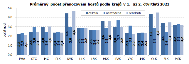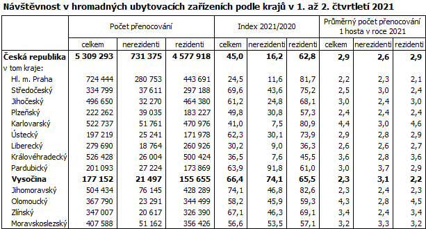 Průměrný počet přenocování na jednoho hosta činil v Kraji Vysočina 2,3. Dlouhodobě nejvyšší je tento ukazatel v Karlovarském kraji (4,4), tentokrát byl ale těsně následován Olomouckým krajem (4.3), nejnižší počet přenocování byl v prvních šesti měsících roku 2021 zaznamenán v Praze (2,2) – stejně jako v prvním čtvrtletí letošního roku.