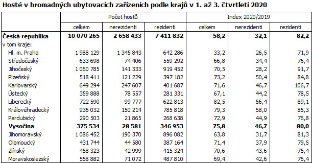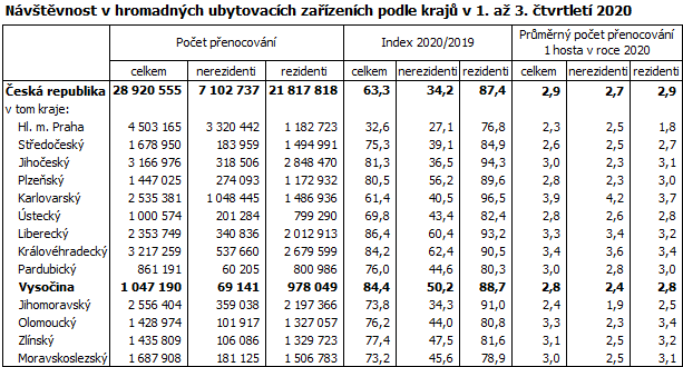 Celkový počet přenocování se v lednu až září 2020 oproti stejnému období předchozího roku na Vysočině snížil o 15,6 %. Vysočina tak byla krajem, kde došlo k druhému nejnižšímu poklesu počtu přenocování, v celé České republice se jejich počet snížil o 36,7 %, z regionů byl největší pokles zaznamenán v Praze (o 67,4 %). Počet přenocování zahraničních návštěvníků se nejvíce snížil v Praze (o 72,9 %), nejmenší pokles přenocování nerezidentů byl zaznamenán v Královéhradeckém kraji (o 37,6 %), v Kraji Vysočina činil pokles 49,8 % (mezi kraji čtvrtý nejnižší). Vývoj počtu přenocování domácích hostů byl na Vysočině o něco příznivější, když jejich úbytek činil 11,3 %, což bylo o 1,3 procentního bodu méně než v celé České republice, v mezikrajském srovnání šlo o sedmý nejnižší úbytek.