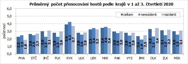 Průměrný počet přenocování na jednoho hosta činil v Kraji Vysočina 2,8. Dlouhodobě nejvyšší je tento ukazatel v Karlovarském kraji (3,9), nejnižší počet přenocování na jednoho hosta bývá tradičně v Jihomoravském kraji, v prvních devíti měsících roku 2020 však Jižní Moravu kvůli nižšímu počtu zahraničních hostů těsně předstihla Praha (2,3).
