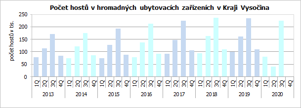 V průběhu prvních tří čtvrtletí roku 2020, v jehož jarních a částečně i letních měsících se naplno projevily dopady pandemie koronaviru, uvítala hromadná ubytovací zařízení (hotely, penziony, chaty atd.) v České republice deset milionů hostů, což bylo o 41,8 % méně než v roce 2019. V Kraji Vysočina se během prvních devíti měsíců roku 2020 v hromadných ubytovacích zařízeních ubytovalo přes 375 tisíc hostů, což představuje meziroční pokles o 24,2 %. Byl to třetí nejnižší pokles ze všech regionů České republiky – díky nižší závislosti na hostech ze zahraničí. Počet hostů se nejvíce zmenšil v Praze (o 66,8 %). Situaci ve většině krajů alespoň částečně zachraňovali během léta domácí turisté, jejichž počet na Vysočině ve 3. čtvrtletí oproti stejnému období roku 2019 vzrostl o 14,6 %, počet ubytování se zvýšil o 15,5 %.