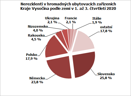 Struktura zahraničních hostů, kteří v prvních devíti měsících roku 2020 navštívili Kraj Vysočina, se příliš neliší od normálních let. Výrazně v ní však převažovali návštěvníci ze Slovenska (25,8 %) a Německa (23,8 %), s odstupem následovaní občany Polska, kteří se na celkovém počtu zahraničních turistů podíleli 17,9 %. Početněji byli zastoupeni také návštěvníci z Rakouska (4,5 %).