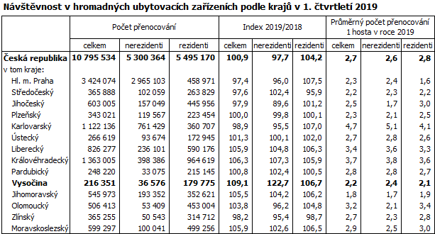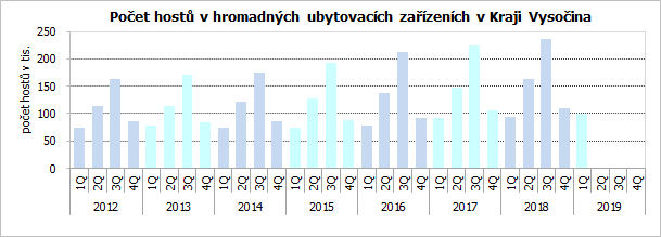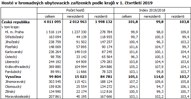 V průběhu 1. čtvrtletí roku 2019 uvítala hromadná ubytovací zařízení (hotely, penziony, chaty atd.) v České republice přes 4,0 miliony hostů, což bylo o 1,8 % více než ve stejném období roku 2018. V Kraji Vysočina se během prvních tří měsíců roku 2019 v hromadných ubytovacích zařízeních ubytovalo bezmála sto tisíc hostů, což představuje meziroční nárůst o 5,1 %. Byl to třetí nejvyšší nárůst ze všech regionů České republiky po Jihomoravském a Královéhradeckém kraji. Počet hostů se snížil ve třech regionech – Praze, Středočeském a zejména Ústeckém kraji (-3,7 %).