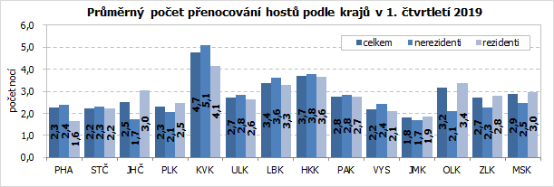 Průměrný počet přenocování na jednoho hosta činil v Kraji Vysočina 2,2. Dlouhodobě nejvyšší je tento ukazatel v Karlovarském kraji (4,7), nejnižší počet přenocování byl v prvních třech měsících roku 2019 (rovněž tradičně) zaznamenán v Jihomoravském kraji (1,8).
