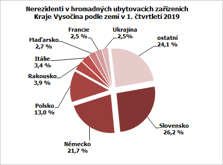 Struktura zahraničních hostů, kteří v prvních třech měsících roku 2019 navštívili Kraj Vysočina, je pestrá, výrazně v ní však tradičně převažovali návštěvníci ze Slovenska a Německa, kteří se na celkovém počtu zahraničních turistů podíleli 26,2 % a 21,7 %. Početněji byli zastoupeni ještě návštěvníci z Polska.
