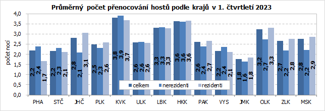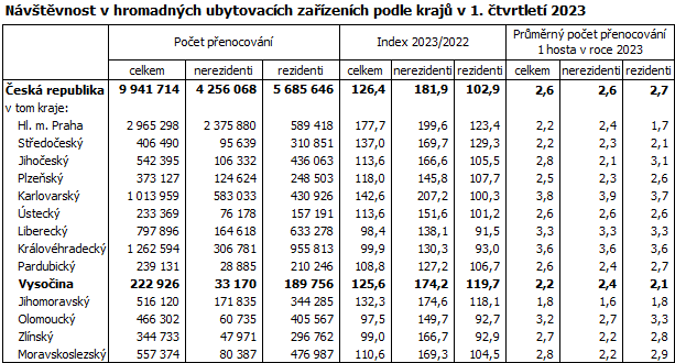 Průměrný počet přenocování na jednoho hosta činil v Kraji Vysočina 2,2, stejně jako v Praze a Středočeském kraji. Dlouhodobě nejvyšší je tento ukazatel v Karlovarském kraji, i když v 1. čtvrtletí 2023 nebyl rozdíl oproti dalším regionům tak výrazný jako v minulosti. Nejnižší počet přenocování byl v prvních třech měsících roku 2022 zaznamenán v Jihomoravském kraji (1,8) – stejně jako ve většině předchozích let.