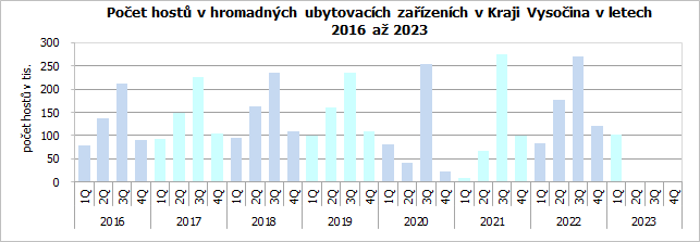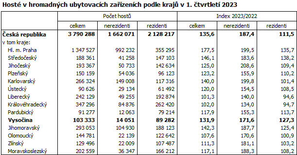 V průběhu 1. čtvrtletí roku 2023 uvítala hromadná ubytovací zařízení (hotely, penziony, chaty atd.) v České republice téměř 3,8 milionu hostů, což bylo ve srovnání se skutečností stejného období roku 2022 zhruba o 35 % více. Počátkem minulého roku však ještě platila protiepidemická opatření, která na cestovní ruch silně doléhala. V Kraji Vysočina se během prvních tří měsíců roku 2023 v hromadných ubytovacích zařízeních ubytovalo přes 103 tisíc hostů, což představuje meziroční nárůst o 31,9 %. Šlo o pátý nejvyšší nárůst ze všech regionů České republiky, nejvíce počty návštěvníků narostly v Praze.