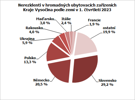 Struktura zahraničních hostů, kteří v prvních třech měsících roku 2023 navštívili Kraj Vysočina, se oproti minulosti příliš nezměnila. I nadále v ní převažovali návštěvníci ze Slovenska, jejichž podíl dosáhl 26,2 %, na další místo se zařadili hosté z Německa (21,7 %), více než desetiprocentní podíl měli ještě návštěvníci z Polska. Podíl hostů z jiných zemí s výjimkou Ukrajinců nepřesáhl pět procent.