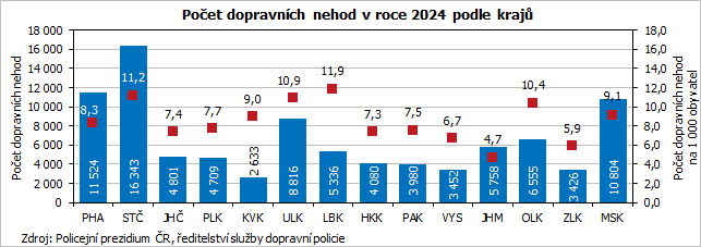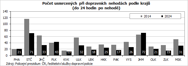 - Nehody s tragickými následky se v roce 2024 odehrály nejčastěji mezi 14. a 15. hodinou, v tomto časovém úseku došlo k usmrcení 5 osob (19,2 %), těžkému zranění 10 (11,8 %) a lehkému zranění 134 osob (9,2 %).