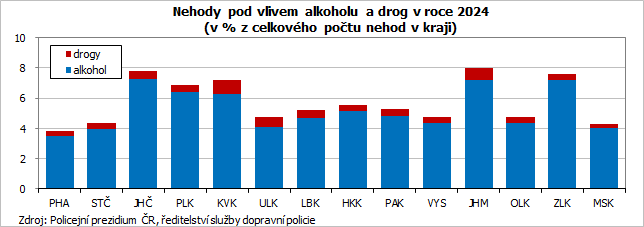Při 164 nehodách, nahlášených v Kraji Vysočina, bylo prokázáno požití alkoholu nebo drogy. Ve 151 případech bylo u viníka dopravní nehody zjištěno požití alkoholu, meziročně se počet dopravních nehod pod vlivem alkoholu zvýšil (o 8 případů, +5,6 %). Větší nárůst se projevil u nehod, při nichž bylo prokázáno požití drogy. Jejich počet skočil z 5 případů v roce 2023 na 13 nehod v roce 2024 (+160 %).