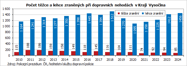 Nejzávažnějším důsledkem dopravních nehod je úmrtí a zranění osob. V roce 2024 zemřelo v Kraji Vysočina při nehodách na pozemních komunikacích 26 osob (meziročně o 5 osob méně; -16,1 %) a 1 541 osob bylo zraněno, z toho 85 zranění byla hodnocena jako těžká. Počet zraněných osob se meziročně zvýšil o 2,3 %. Historicky nejtragičtějším rokem od roku 2010 byl, co se týče úmrtí, rok 2010 s 52 zemřelými osobami, a co do počtu zraněných, rok 2018, kdy došlo při nehodách ke zranění 1 628 osob.