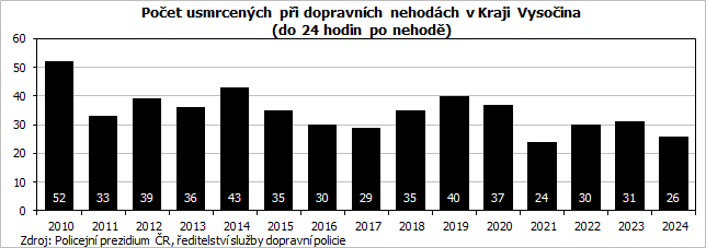 V roce 2024 bylo způsobeno na území Kraje Vysočina 3 452 dopravních nehod, z toho 164 nehod se stalo pod vlivem alkoholu nebo drog (tj. 4,8 % z celkového počtu). Nehody si vyžádaly 26 obětí, 85 těžce a 1 456 lehce zraněných. Průměrná majetková škoda na jednu nehodu přesáhla 105 tis. Kč.