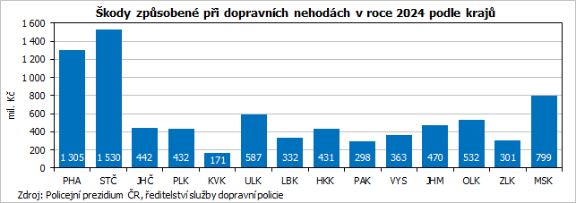 Největší škody způsobené při nehodách bylo v kraji dosaženo v roce 2022. Od tohoto roku sledujeme meziroční poklesy na úrovni 6 %. V roce 2024 dosáhly škody celkové hodnoty téměř 363 mil. Kč. Průměrná škoda vzniklá při jedné nehodě přesahovala 105 tis. Kč, meziročně klesla o více než 3 tis. Kč (-2,9 %). Průměr za celou Českou republiku představoval hodnotu necelých 86,7 tis. Kč na 1 nehodu.