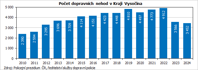 V roce 2024 se dle informací Policejního prezidia ČR při provozu na pozemních komunikacích na území Kraje Vysočina stalo 3 452 dopravních nehod. Proti předchozímu roku se počet nehod snížil o 3,2 %, předchozí meziroční pokles byl významnější (-27,4 %). Jedná se o nejnižší roční počet dopravních nehod za poslední desetiletí. Větší část nehod (konkrétně 1 914; tj. 55,4 %) se stalo na komunikacích v obci, 1 538 nehod mimo obec. Více než tři čtvrtiny nehod (přesně 2 760) nastaly ve dne, 692 nehod v noci.