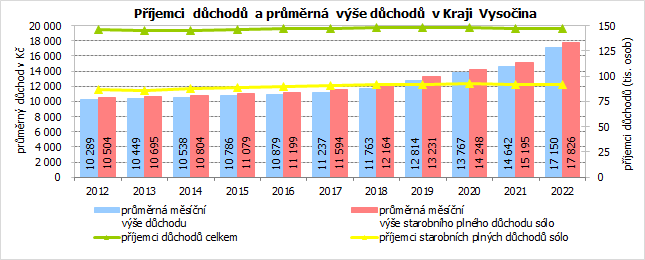 V Kraji Vysočina ke konci roku 2022 pobíralo některý z důchodů 147 tisíc osob. Mezi nimi převládaly plné starobní důchody bez souběhu s vdovským/vdoveckým důchodem (sólo), jejichž průměrná výše ke konci roku 2022 v Kraji Vysočina činila 17 826 Kč a zaostávala tak za celorepublikovým průměrem o 272 Kč. Rozdíl mezi starobními důchody mužů a žen se každým rokem zvyšuje ve prospěch mužů. Muži pobírají starobní důchod o 3 248 Kč vyšší – u žen dosáhl plný sólo starobní důchod v kraji v průměru částky 16 203 Kč a u mužů 19 451 Kč.