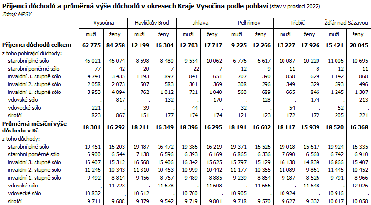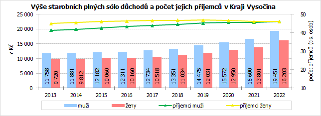 Důchodci muži v Kraji Vysočina pobírali v roce 2022 starobní plný sólo důchod ve výši 19 451 Kč a ženy 16 203 Kč. Rozdíl mezi plnými starobními důchody sólo mužů a žen se oproti předchozímu roku dále zvýšil a v prosinci 2021 na Vysočině činil 3 248 Kč. V celé ČR byl v prosinci 2022 rozdíl mezi průměrným plným starobním sólo důchodem mužů a žen 3 298 Kč ve prospěch mužů.