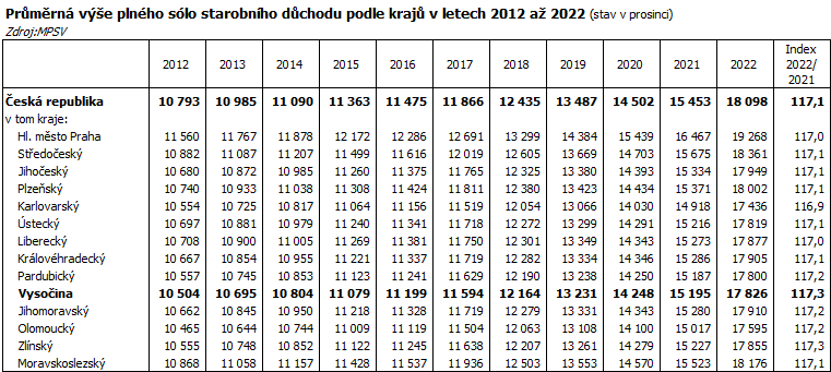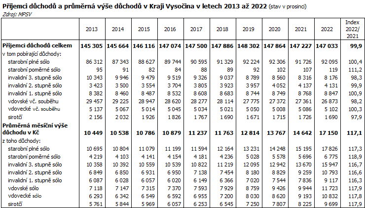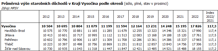 Starobní důchod plný sólo pobíralo v prosinci 2022 v Kraji Vysočina 92 095 osob, což představuje meziroční nárůst o 369 osob, tj. o 0,4 %. Ke mírnému nárůstu počtu osob pobírajících plný starobní důchod (sólo) došlo ve všech okresech kraje s výjimkou Třebíčska, kde jejich počet stagnoval. Více než o 120 osob počet příjemců plného starobního důchodu sólo vzrostl v okresech Jihlava a Žďár nad Sázavou. V České republice ubylo meziročně téměř šest tisíc plných starobních důchodců sólo (-0,3 %) a jejich počet poklesl pod hranici 1,78 milionu osob.