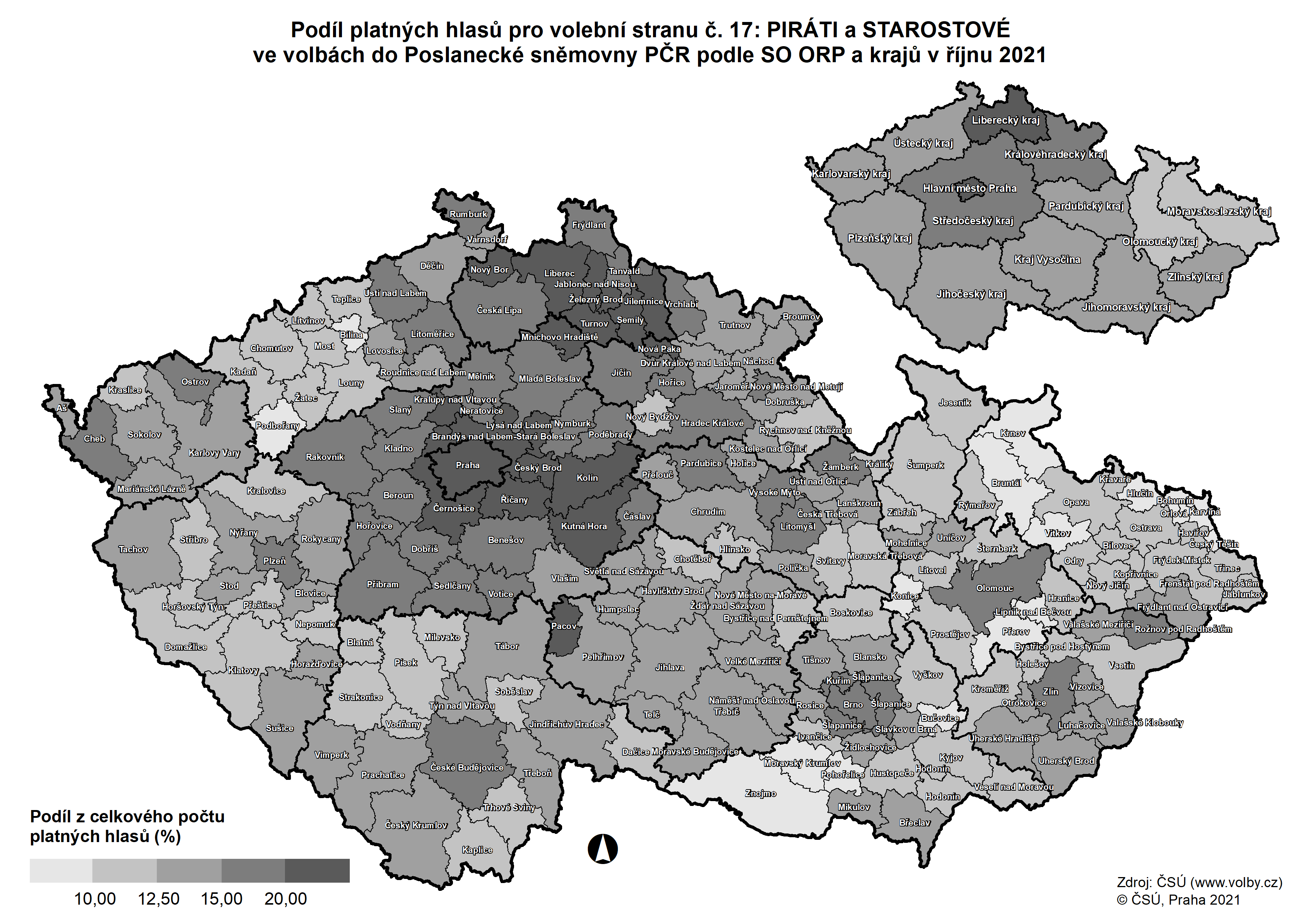 Podíl platných hlasů pro stranu č. 17 - PIRSTAN podle SO ORP a krajů
