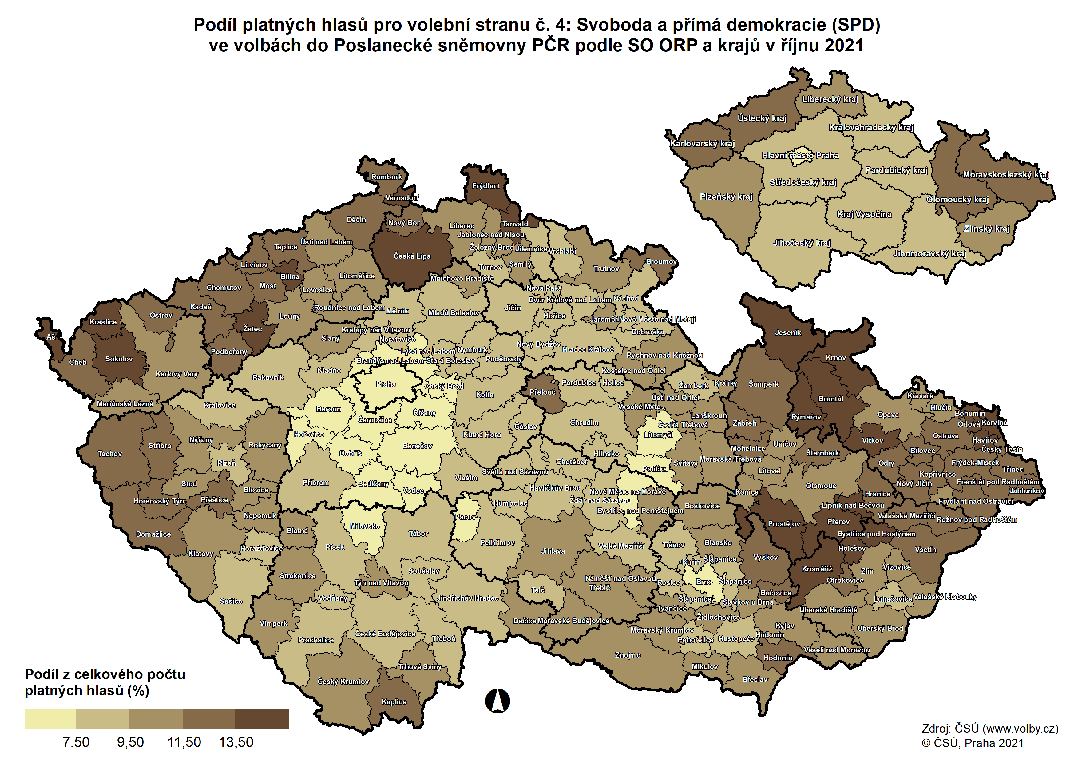 Podíl platných hlasů pro stranu č. 13 - SPOLU podle SO ORP a krajů