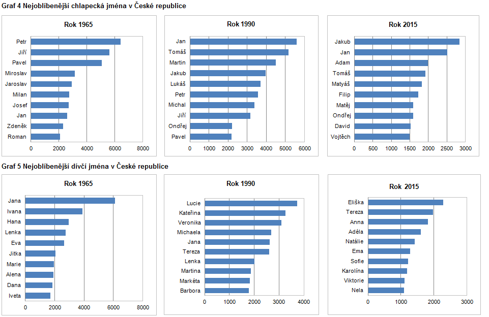 Obliba jednotlivých jmen se v průběhu času výrazně mění, dá se říci, že značně podléhá vlivu doby a módy. Proměnlivost obliby jmen naznačují Graf 4 a Graf 5, zachycující desítku nejrozšířenějších jmen, která dostávali novorození chlapci a dívky v letech 1965, 1990 a 2015. U chlapeckých jmen se ve všech třech letech v této elitní desítce udržel pouze Jan, dalších šest jmen se vyskytuje ve dvou letech. U dívčích jmen byla obměna podstatně větší, dvakrát v této desítce nacházíme pouze Janu, Lenku a Terezu, ostatní jména se vyskytují pouze jednou.