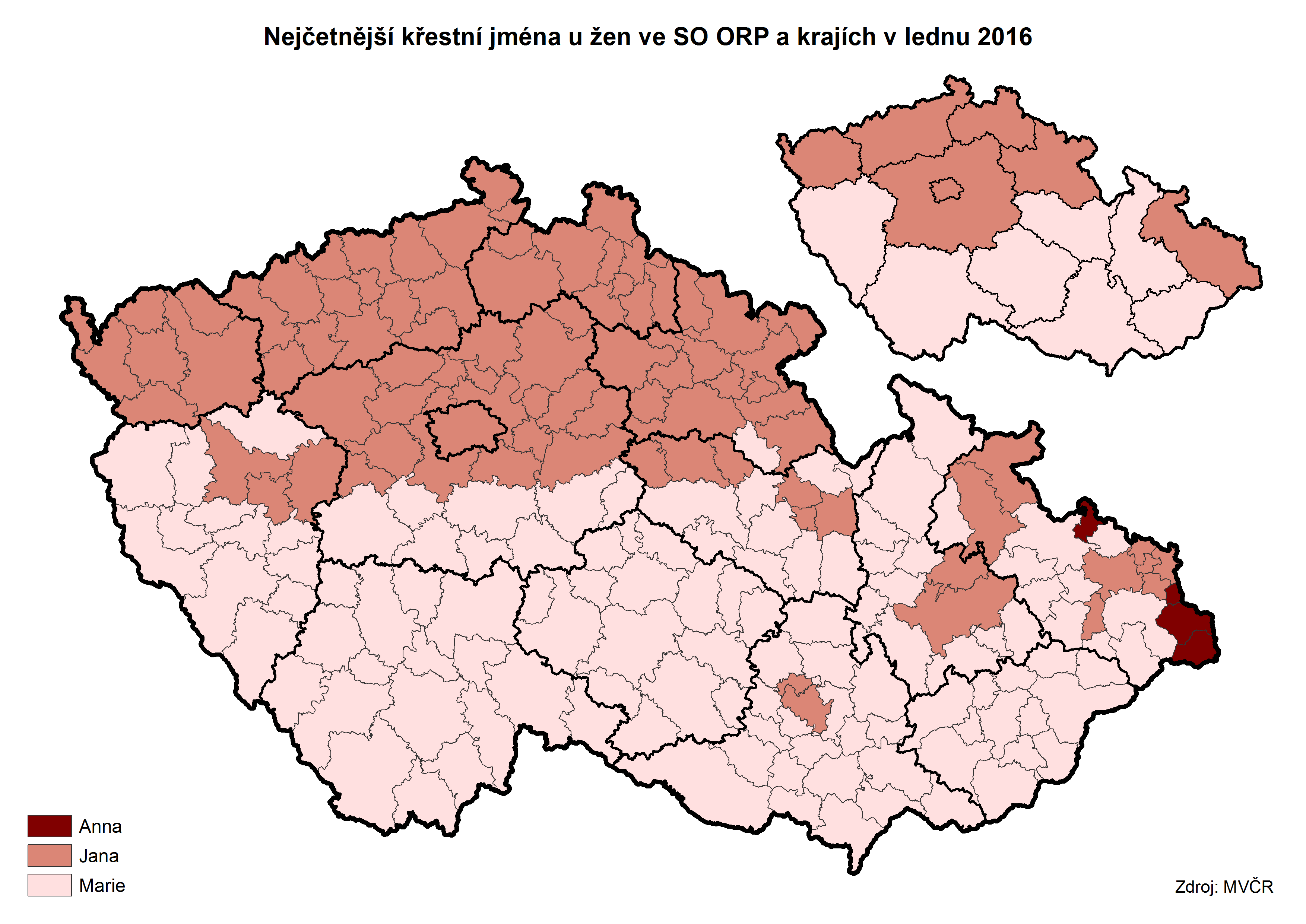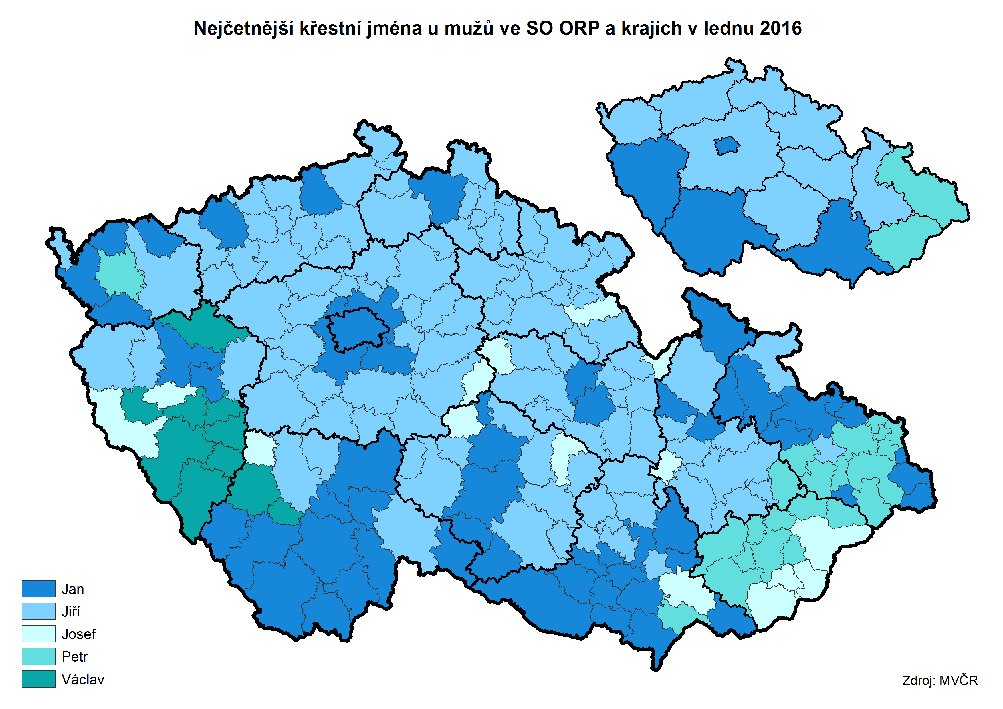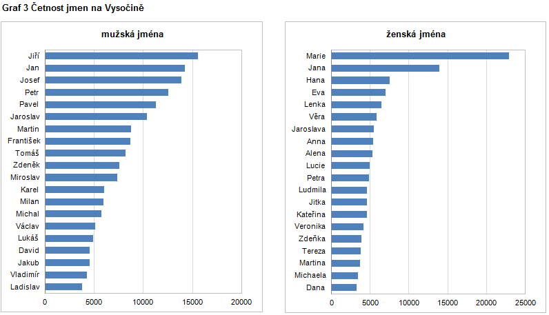 Zdaleka nejoblíbenějším mužským jménem je v České republice Jiří, následovaný Janem a Petrem. U ženských jmen je na prvním místě Marie, za ní se řadí Jana a Eva. Jméno Jiří stojí na prvním místě i v Kraji Vysočina, kde žije více než 15 500 jeho hrdých nositelů, rovněž Jan drží druhé místo, ale na třetím je na Vysočině tradiční Josef. Také u ženských jmen je na prvních dvou místech pomyslného žebříčku pořadí shodné s Českou republikou, Marií je v kraji téměř třiadvacet tisíc, za nimi s velikým odstupem následují Jany a Hany. Dvacet nejoblíbenějších mužských a ženských jmen na Vysočině zachycuje Graf 3.