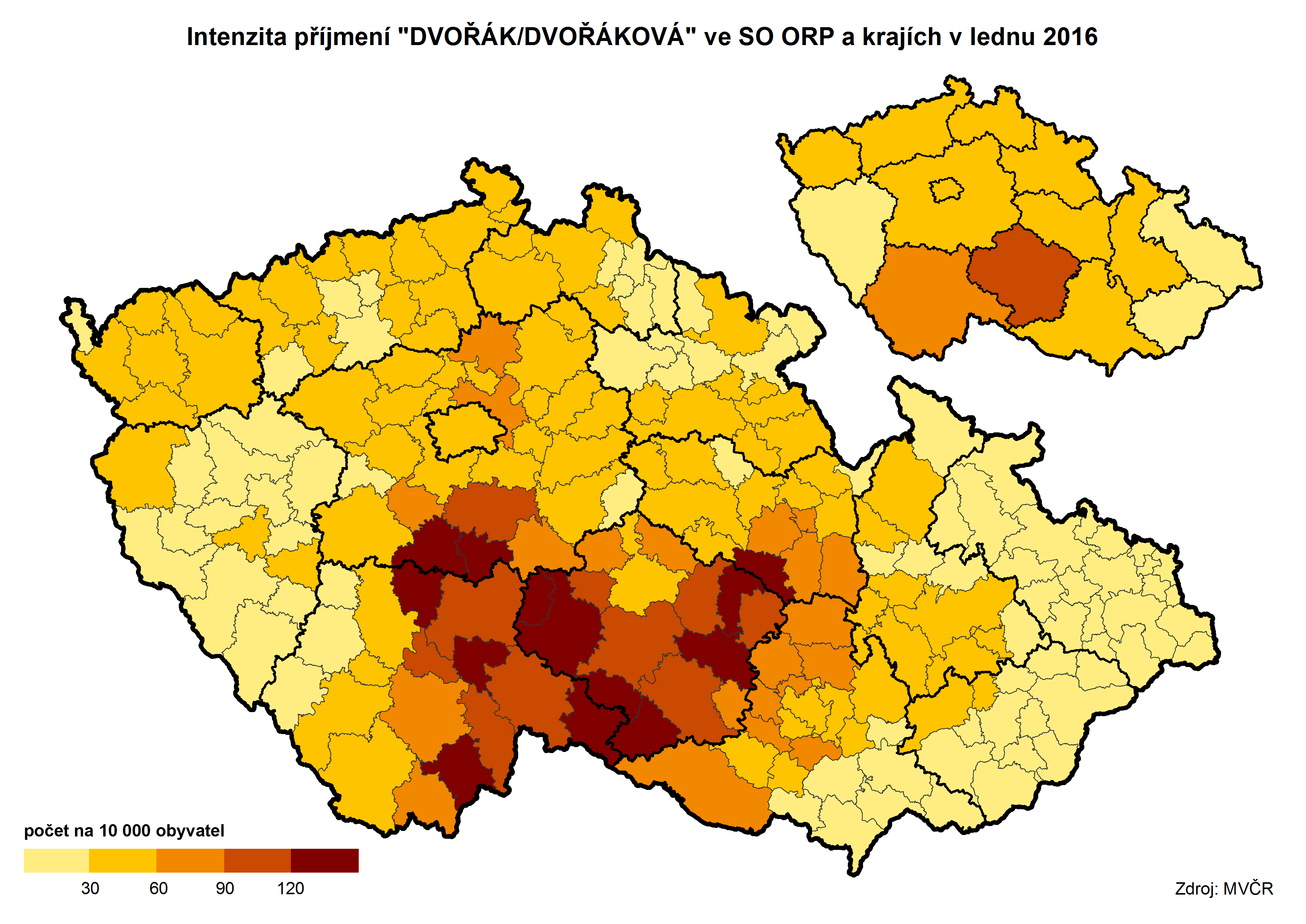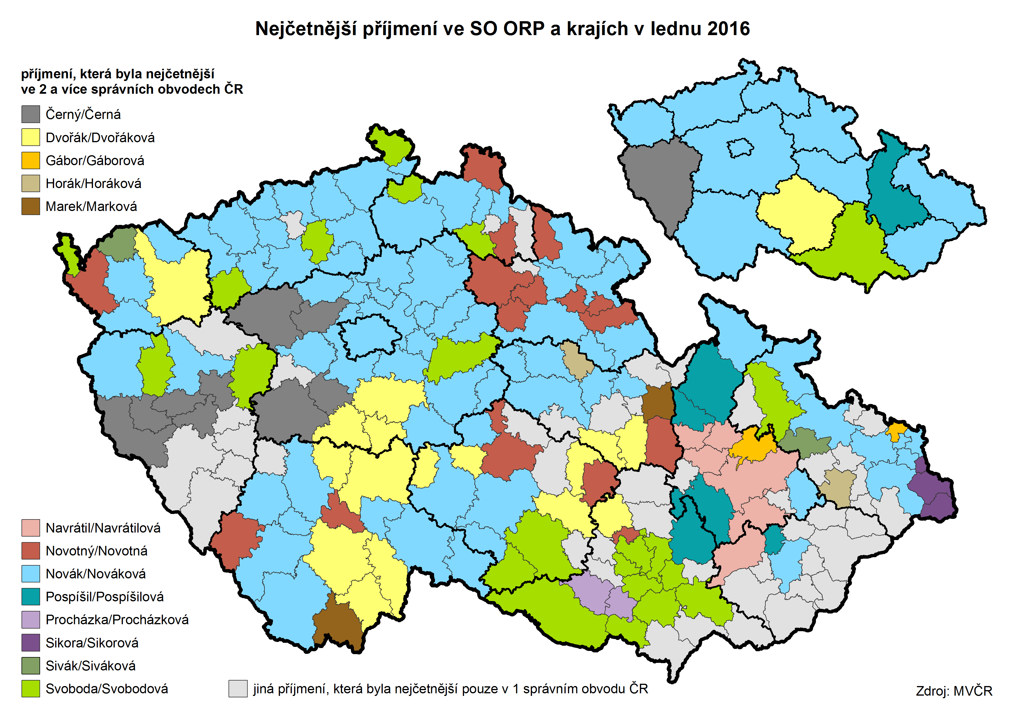 Pohled na nejrozšířenější mužská a ženská příjmení v patnácti správních obvodech Kraje Vysočina nabízí Graf 2. Vidíme, že v kraji celkově nejvíce zastoupené příjmení Dvořák/Dvořáková je nejčetnější jen ve třech správních obvodech ORP (ale v případě mužských příjmení je v dalších šesti obvodech Dvořák na druhém místě, u ženských příjmení je Dvořáková druhá dokonce sedmkrát), nejčastěji dominují Nováci a Novákové – shodně čtyřikrát.