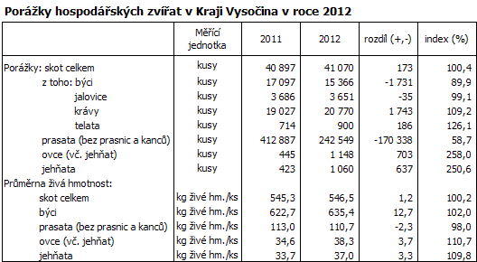 V loňském roce bylo v kraji poraženo celkem 41 070 kusů skotu, a to je o 173 kusů více v porovnání s rokem 2011 (index 100,4 %). Průměrná živá váha jednoho poraženého kusu skotu činila 546,5 kg a oproti stejnému období loňského roku se zvýšila o 1,2 kg (index 100,2 %). Naopak o 40 % ubylo porážek prasat (bez prasnic a kanců). Celkem bylo na Vysočině poraženo 242 549 kusů s průměrnou váhou 111 kg.
