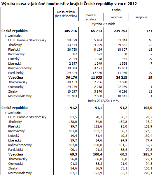 Kraj Vysočina i v roce 2012 patřil mezi významné producenty masa v České republice v jatečné hmotnosti (bez drůbežího). Tuto pozici si kraj udržel, i když proti roku 2011 bylo vyrobeno o téměř 30 % masa méně. Na celorepublikové produkci se kraj podílí 11,8 %. Z tradičních druhů masa poklesla pouze výroba vepřového masa, kterého zemědělské podniky dodaly na trh 24 215 tun, což je o 39,9 % méně než v roce 2011, ale přesto je to čtvrté nejvyšší množství v republice. Na celkové produkci masa v Kraji Vysočina se vepřové maso podílí 67 %. V loňském roce byla Vysočina po Pardubickém kraji největším výrobcem masa hovězího a telecího, kterého bylo vyprodukováno 11 935 tun, což představuje meziroční zvýšení o 0,4 %. Masa skopového bylo vyrobeno 19 tun, při meziročním nárůstu o 185,7 %.