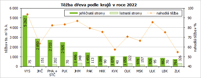 Nahodilá těžba je těžba dřeva prováděná za účelem zpracování stromů suchých, vyvrácených, nemocných nebo poškozených v důsledku působení škodlivých činitelů (abiotické a biotické příčiny jako např. vítr, sníh, námraza, škodlivý hmyz, houbové choroby). Objem zpracované nahodilé těžby dřeva (bez kůry) se v Kraji Vysočina meziročně snížil o 31,6 % na hodnotu 5 004 tisíc m3. Nejčastějším důvodem pro nahodilou těžbu byly na Vysočině v roce 2022 kalamity způsobené hmyzem (76,9 %). Další významnou příčinou byly živelní pohromy, převážně v polomech a vývratech bylo vytěženo 17,5 % zpracované nahodilé těžby. Poměr mezi příčinami nahodilé těžby se změnil. Zatímco v roce 2021 bylo škod způsobených hmyzem 7krát více než škod živelných, v roce 2022 škodil hmyz jen na ploše 4,5krát větší než živly.