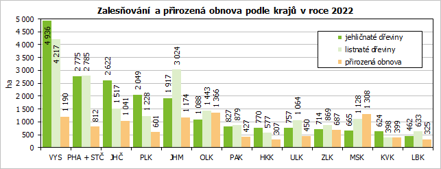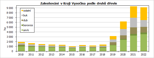 V posledních třech letech sledujeme na Vysočině značný nárůst zalesňování. V roce 2021 byla zalesněna rekordní plocha 9 310 hektarů, v roce 2022 plocha pouze o necelá 2 % menší, a to 9 153 ha. Zatímco v roce 2021 převažovala plocha nově zalesněná listnatými dřevinami, v roce 2022 bylo vysazeno více jehličnanů. Jehličnaté dřeviny byly vysázeny na 4 936 hektarech, tj. na 53,9 % nově zalesněné půdy. Smrk, nejvíce při zalesňování používaná dřevina, byl vysazen na 3 535 hektarech (tj. 38,6 %) zalesňované plochy. V porovnání podílů dřevin použitých při zalesňování na Vysočině v průběhu posledních čtyřech let si lze všimnout, že byl pokles výsadby smrků přerušen přibližně 10 % meziročním přírůstkem. Borovice byly vysazeny na 362 hektarech (4 %). Listnaté dřeviny byly použity k zalesnění 4 217 hektarů (46,1 %). Z listnatých dřevin bylo na Vysočině vysázeno nejvíce buku (15,7 % zalesňované plochy) a dubu (12,5 %). Přirozenou obnovou les regeneroval na ploše 1 190 hektarů.