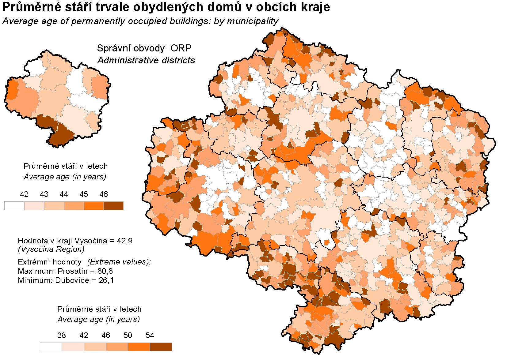 Průměrné stáří trvale obydlených domů v obcích kraje