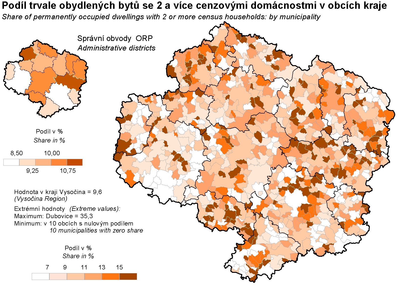 Podíl trvale obydlených bytů se 2 a více cenzovými domácnostmi v obcích kraje