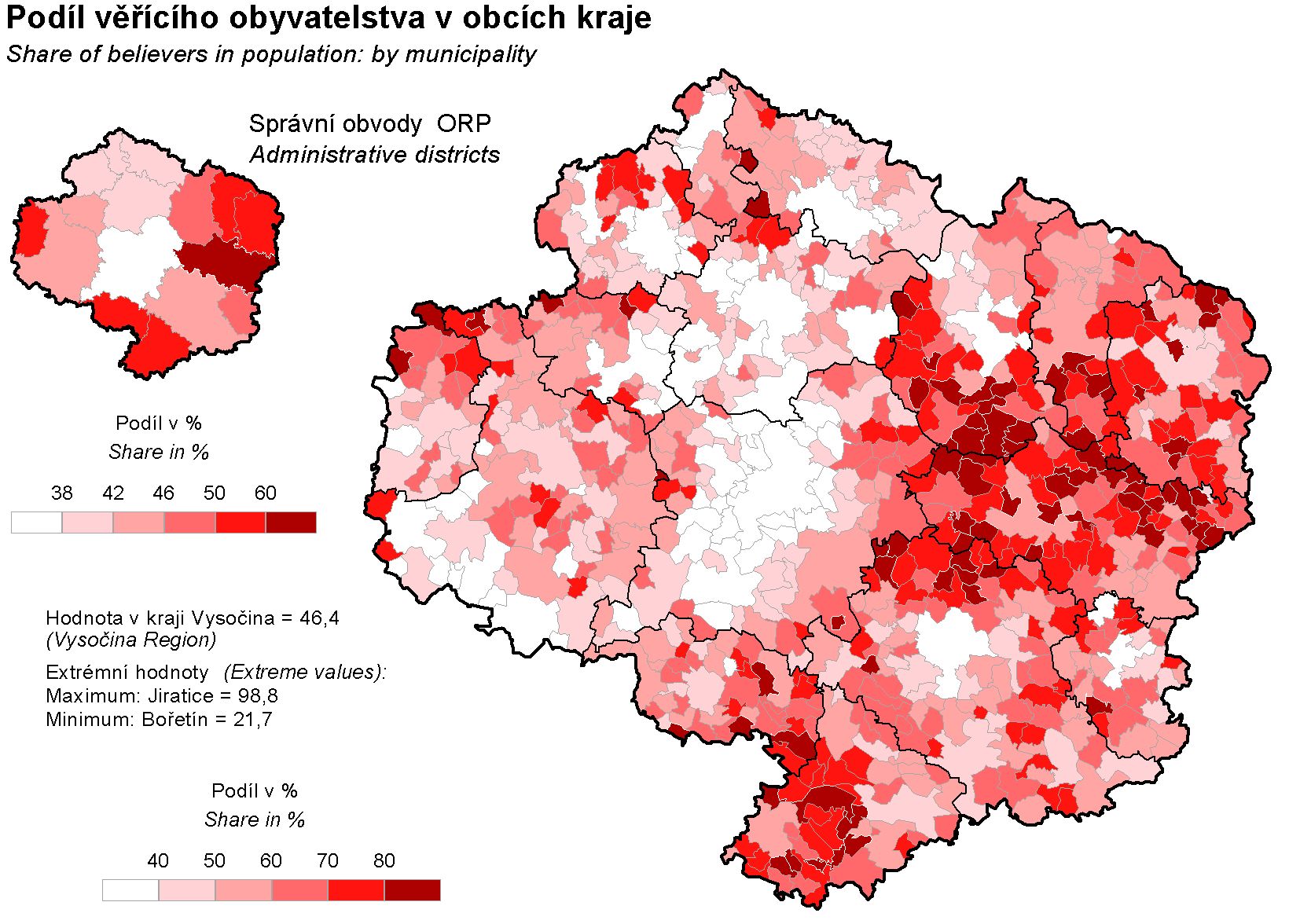 Podíl věřícího obyvatelstva v obcích kraje