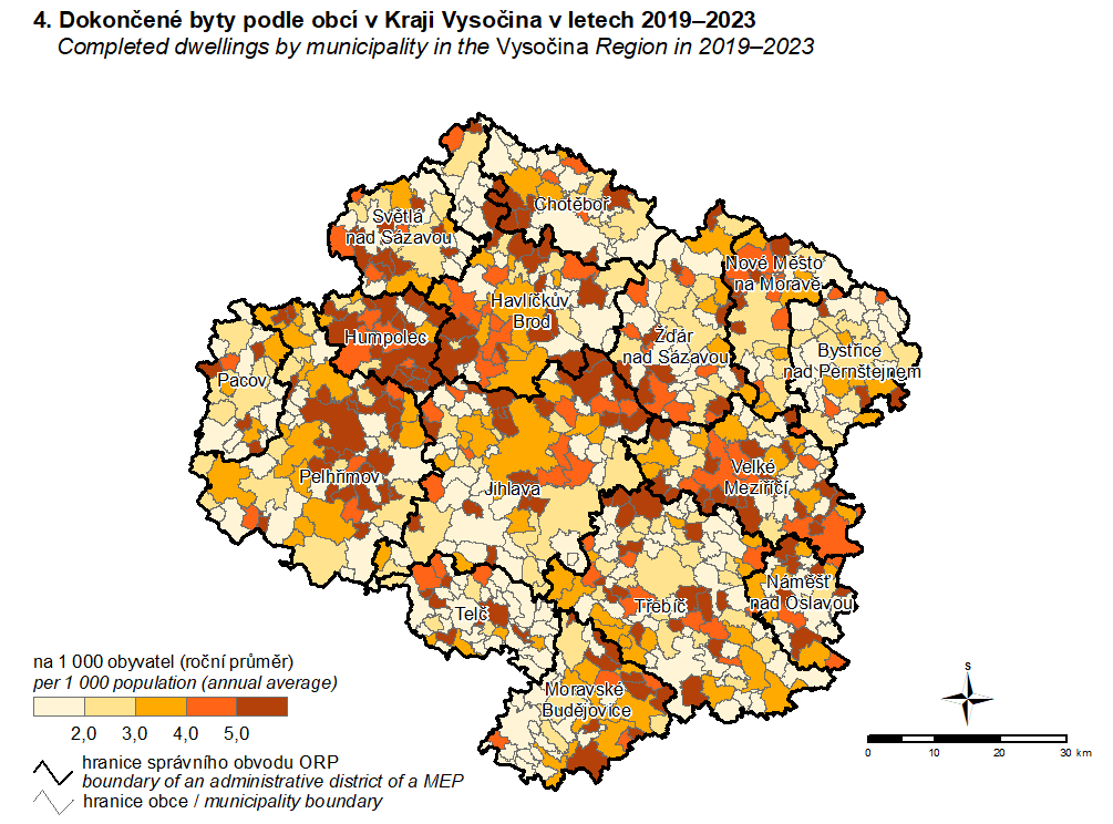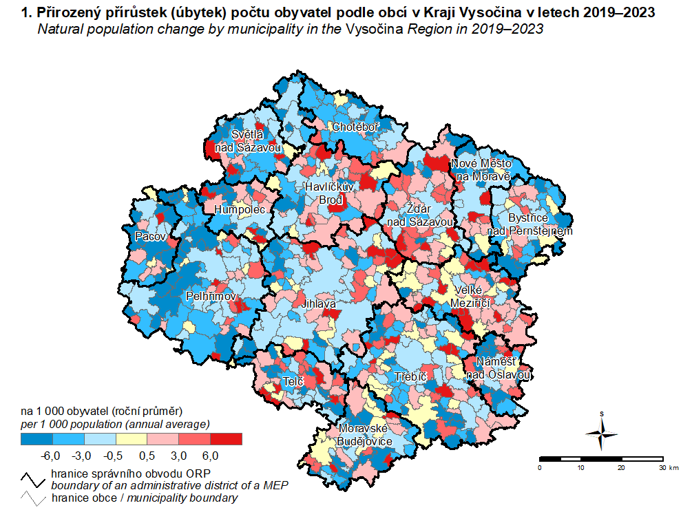 Základní samosprávnou jednotkou Kraje Vysočina jsou obce, kterých je 704 (stav od 1. ledna 2005), tj. druhý nejvyšší počet ze všech krajů. Obec na Vysočině má v průměru 731 obyvatel, tedy nejméně ze všech krajů České republiky. V kraji jsou nejčetněji zastoupeny obce s méně než 500 obyvateli. Statut města má v současnosti 35 obcí kraje, což je v rámci České republiky vzhledem k velikosti regionu mírně podprůměrné.